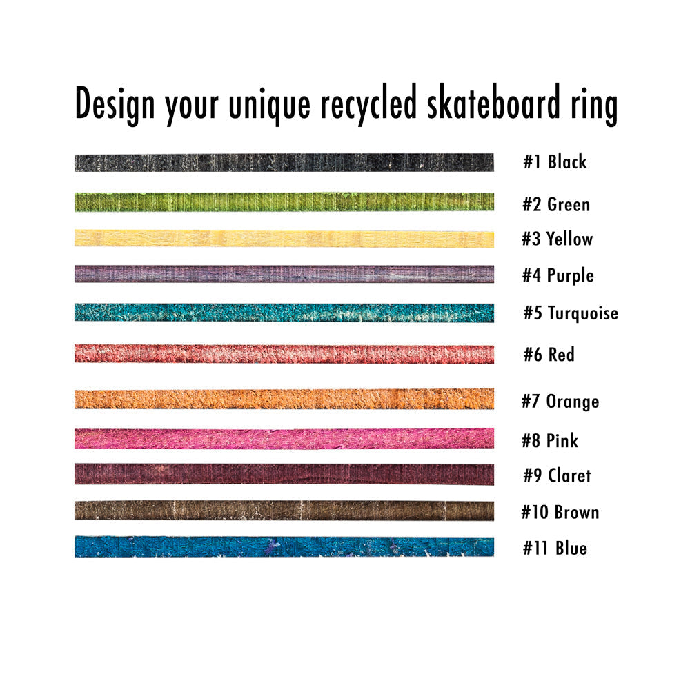 Unsere Ringe bestehen aus recycelten Skateboards, kanadischem Ahornholz, Carbon und verschiedenen Metallen (Sterlingsilber 925, Gold 8 Karat, Gold 14 Karat, Titan).