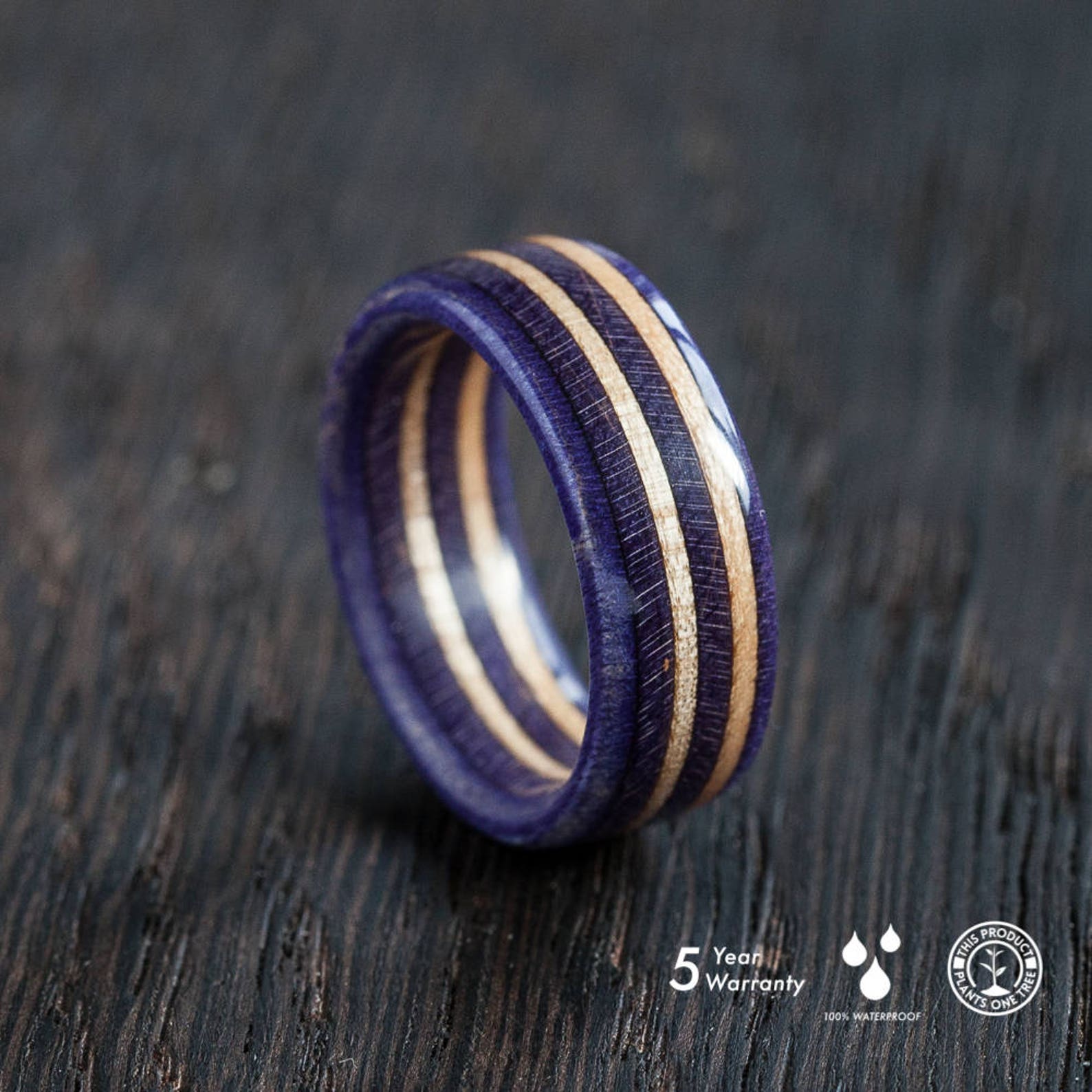 • Unsere Ringe bestehen aus recycelten Skateboards, kanadischem Ahornholz, Carbon und verschiedenen Metallen (Sterlingsilber 925, Gold 8 Karat, Gold 14 Karat, Titan).