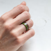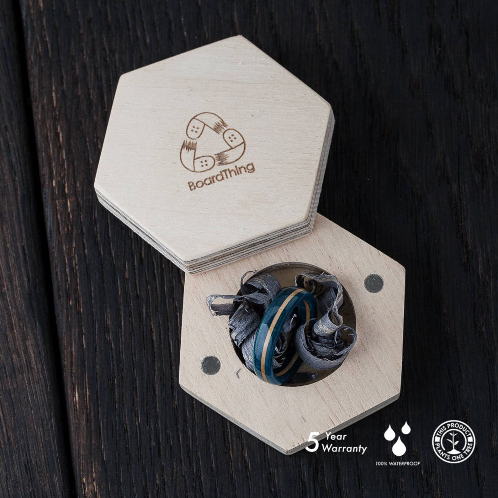 • Nos bagues sont fabriquées à partir de skateboards recyclés, de bois d'érable canadien, de carbone et de différents métaux (argent sterling 925, or 8k, or 14k, titane).